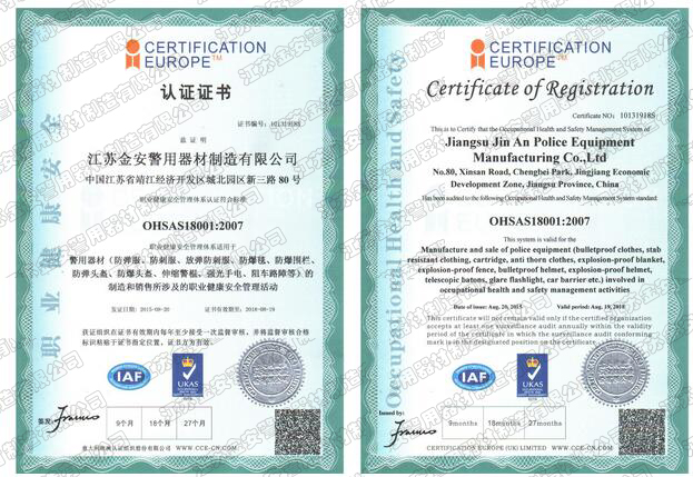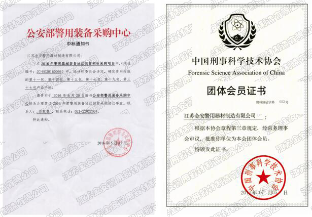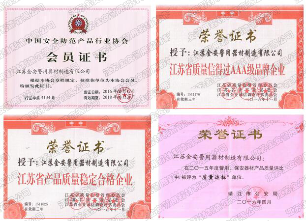 第一批新型單警裝備定點生產(chǎn)企業(yè) 公安部警用裝備采購中心協(xié)議供貨單位 公安部防彈防刺服生產(chǎn)定點企業(yè) 江蘇省公安廳防彈衣入圍企業(yè) 江蘇警用裝備行業(yè)協(xié)會會員單位 中國刑事科學(xué)技術(shù)協(xié)會團隊會員單位 中國安全防范產(chǎn)品行業(yè)協(xié)會會員單位 靖江市保安器材行業(yè)協(xié)會常務(wù)理事單位 全國警用裝備標準化技術(shù)委員會通訊委員 江蘇金安警用器材制造有限公司始創(chuàng)于九十年代初,公安部防彈防刺服生產(chǎn)定點企業(yè)、公安部警用裝備采購中心2..